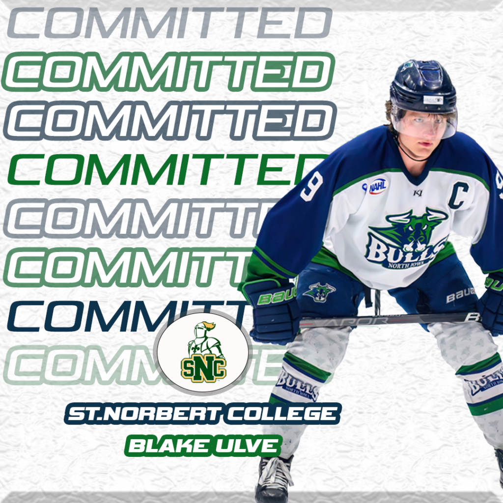 Mason City, IA- The North Iowa Bulls are thrilled to announce that forward and 2023-24 Captain Blake Ulve has committed to play NCAA DIII Hockey at St. Norbert College, in De Pere, Wisconsin.