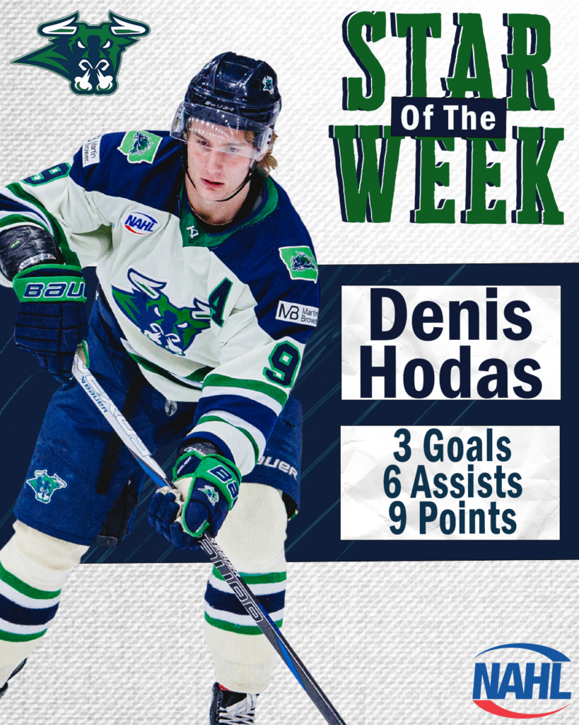 Mason City, IA – North Iowa Bulls Forward & Assistant Captain Denis Hodas has been named the NAHL Central Division’s Star of the Week for the final week of the 2025-26 regular season.