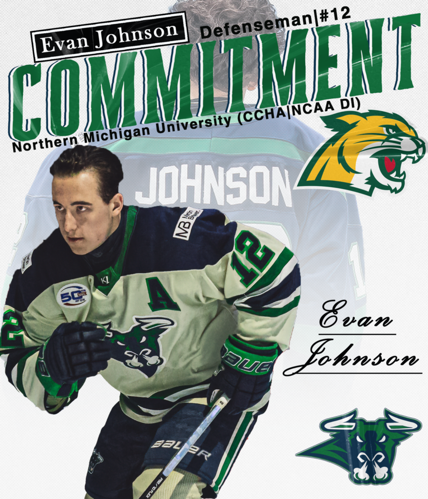 Mason City, IA- North Iowa Bulls defenseman and Assistant Captain Evan Johnson has committed to play NCAA Division I Hockey at Northern Michigan University, in Marquette, MI.