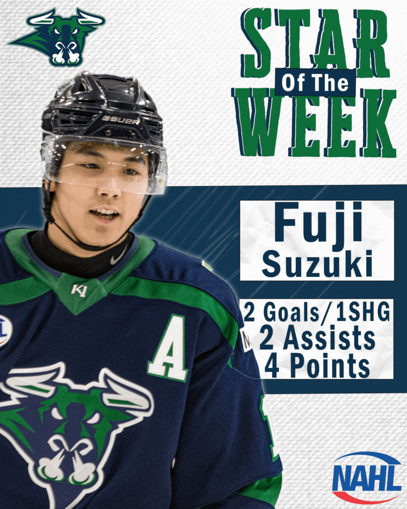 Mason City, IA- North Iowa Bulls Forward and Assistant Captain Fuji Suzuki has been named as the NAHL Central Division’s Star of the Week for his performance in the Bulls’ two game series in Bismarck against the Bobcats. In Saturday, November 8th night’s victory which snapped the Bulls’ losing skid against the Bobcats, Suzuki recorded two goals and two assists for a remarkable four-point performance. It’s the highest single-game point output for any Bull this season. The first of Suzuki’s goals was a shorthanded tally, the second such goal for the Bulls this season and the first of Suzuki’s NAHL Career. His second goal tied the game and sent the game into overtime. Suzuki then assisted on Vitaliy Korolyuk’s overtime winning goal.