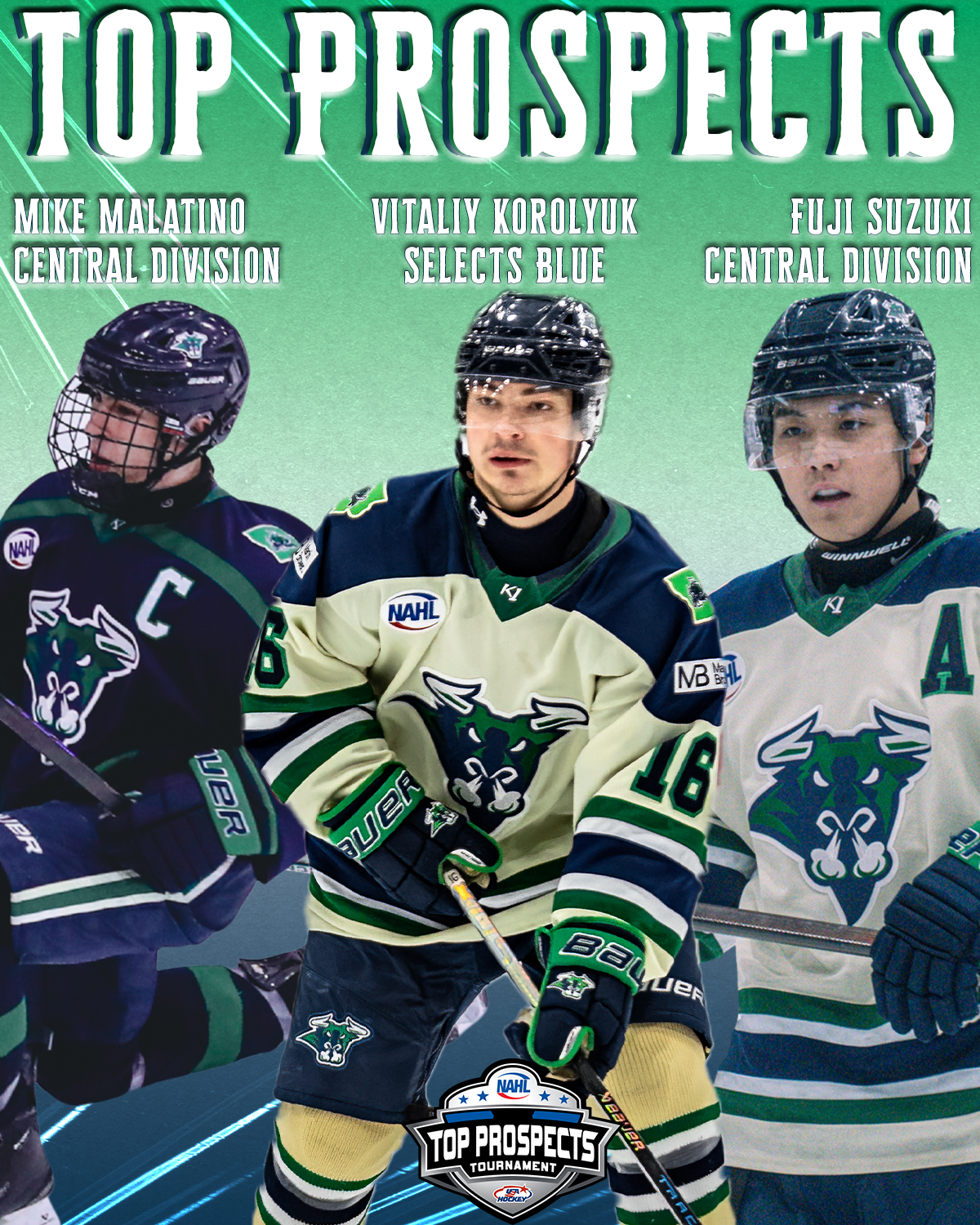 Mason City, IA- North Iowa Bulls skaters Vitaliy Korolyuk, Assistant Captain Fuji Suzuki, and Captain Mike Malatino have been selected to represent the Bulls at the 2026 North American Hockey League’s Top Prospects Tournament.